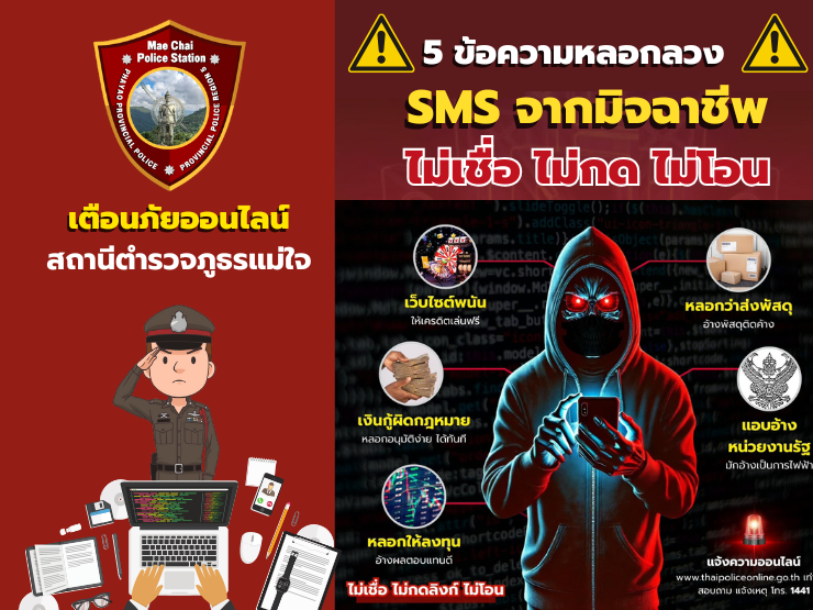 🚨 สภ.แม่ใจ เตือนภัย! ระวัง 5 ข้อความ SMS มิจฉาชีพ หลอกให้คลิก – ลวงให้โอนเงิน 💸 📢 ประชาสัมพันธ์แจ้งเ