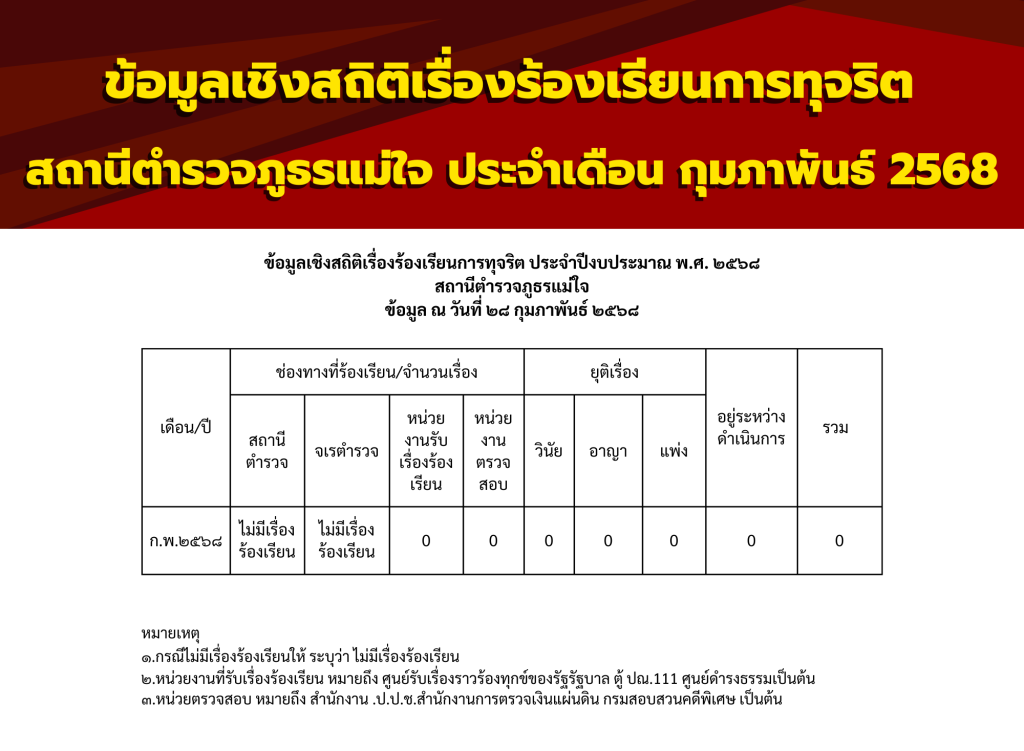ข้อมูลเชิงสถิติเรื่องร้องเรียนการทุจริต ประจำเดือน กุมภาพันธ์ 2568
