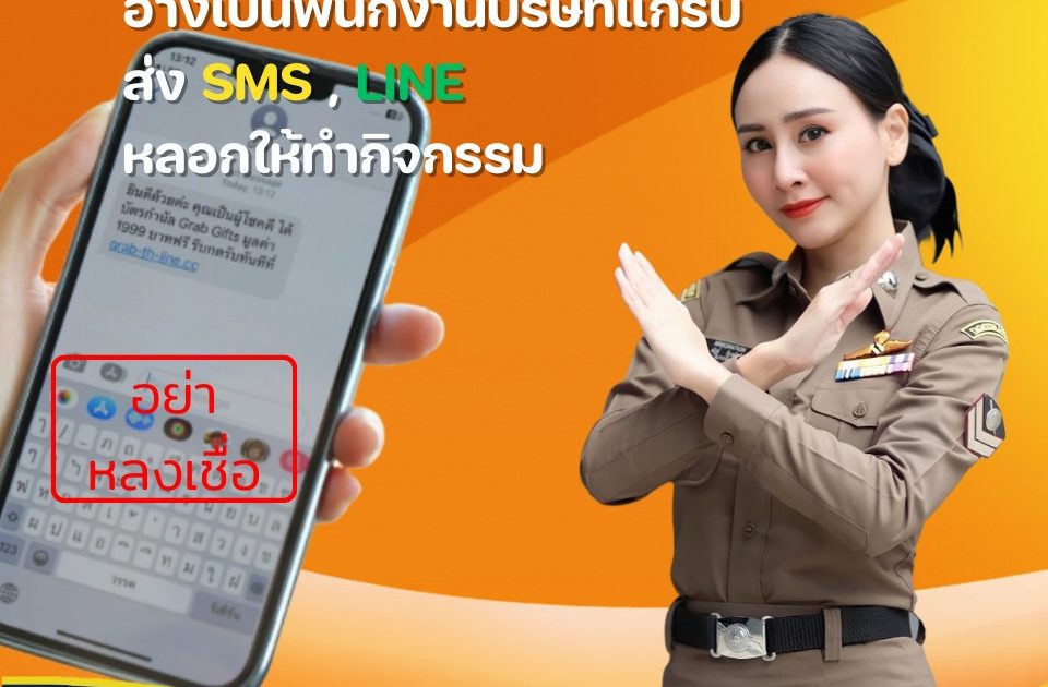 มิจฉาชีพแอบอ้างเป็นพนักงานของบริษัทแกร็บ โดยนำชื่อและโลโก้ของแกร็บไปใช้ติดต่อกับเหยื่อผ่านช่องทาง SMS และ Line chat