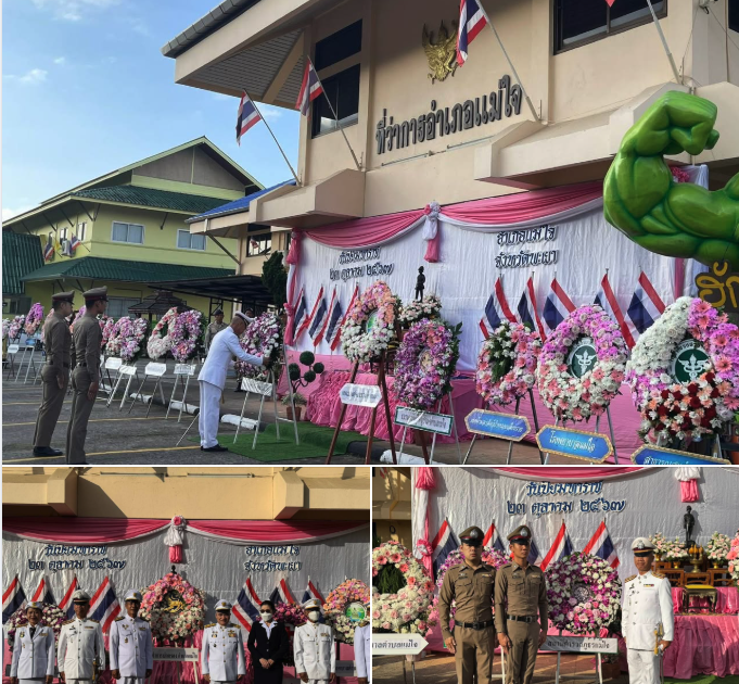 วันที่ 23 ตุลาคม 2567 เวลา 07.00 น. นายพีรัช จันธิมา นายอำเภอแม่ใจ ได้เป็นประธานในพิธีวางพวงมาลาเนื่องในวันคล้ายวันสวรรคตของพระบาทสมเด็จพระจุลจอมเกล้าเจ้าอยู่หัว “วันปิยมหาราช” ณ บริเวณลานหน้าที่ว่าการอำเภอแม่ใจ จังหวัดพะเยา โดยมีหัวหน้าส่วนราชการ หัวหน้าหน่วยงานรัฐวิสาหกิจ นายกองค์กรปกครองส่วนท้องถิ่น กำนัน ผู้ใหญ่บ้าน ผู้บริหารสถานศึกษา องค์กรภาคเอกชน พร้อมข้าราชการ เจ้าหน้าที่ และพสกนิกรชาวอำเภอแม่ใจทุกหมู่เหล่า เข้าร่วมพิธีโดยพร้อมเพรียงกัน