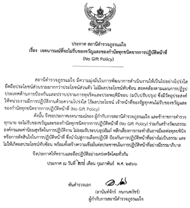 ประกาศ สถานีตำรวจภูธรแม่ใจ เรื่อง เจตนารมณ์ที่จะไม่รับของขวัญฯ No Gift Policy