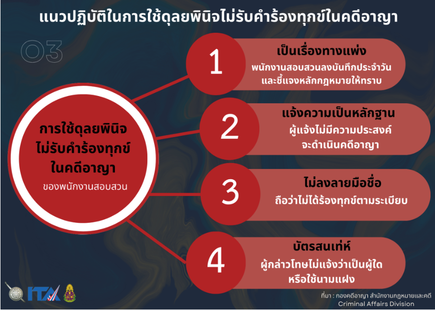 เช่น ในคดีความผิดตาม พรบ.เช็ค,คดีฉ้อโกง ยักยอก ซึ่งเป็นคดีความผิดต่อส่วนตัวที่กฎหมายกำหนดให้ต้องร้องทุกข์ภายใน ๓ เดือน เจ้าหน้าที่ละเว้นการปฏิบัติหน้าที่ หรือใช้ดุลพินิจไม่ถูกต้อง แนวทางแก้ไขเมื่อเจ้าหน้าที่ตำรวจไม่รับแจ้งความร้องทุกข์ท่านต้องดำเนินการว่าจ้างทนายความเพื่อฟ้องร้องดำเนินคดีด้วยตนเอง หรือมอบหมายให้ทนายเป็นผู้ร้องทุกข์ตามกฎหมายแทนท่านต่อไป