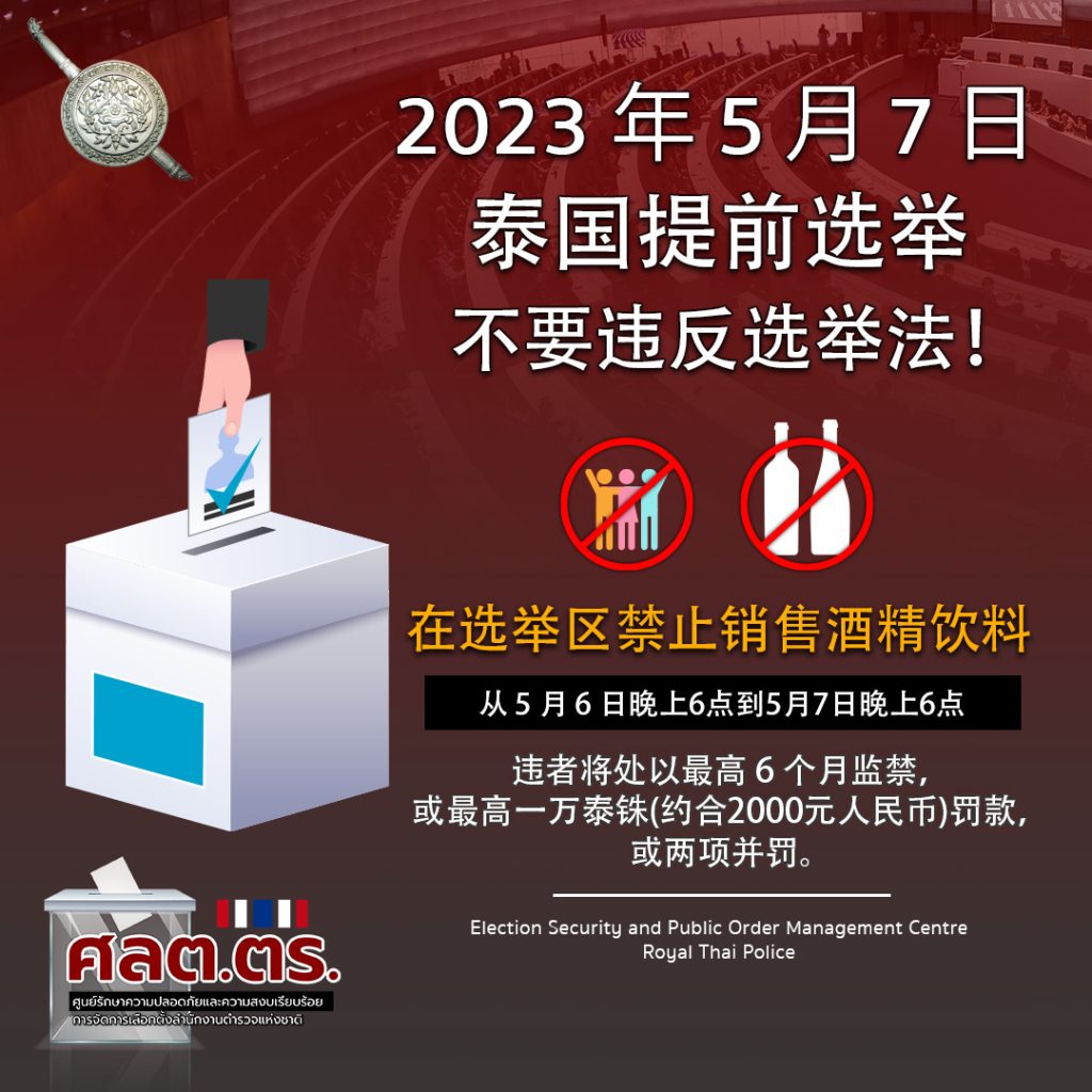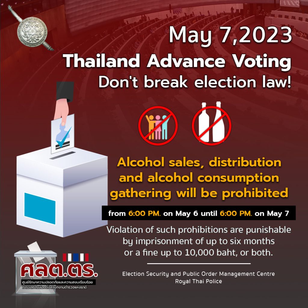 คณะกรรมการการเลือกตั้ง ได้ประกาศว่า ห้ามขาย จำหน่าย จ่ายแจก หรือจัดเลี้ยงสุราทุกชนิด ตั้งแต่ 18.00 น. ของวันที่ 6 พฤษภาคม 2566 จนถึงเวลา 18.00 น. ของวันที่ 7 พฤษภาคม 2566 หากฝ่าฝืนมีโทษจำคุกไม่เกิน 6 เดือน หรือปรับไม่เกิน 10,000 บาท หรือทั้งจำทั้งปรับ