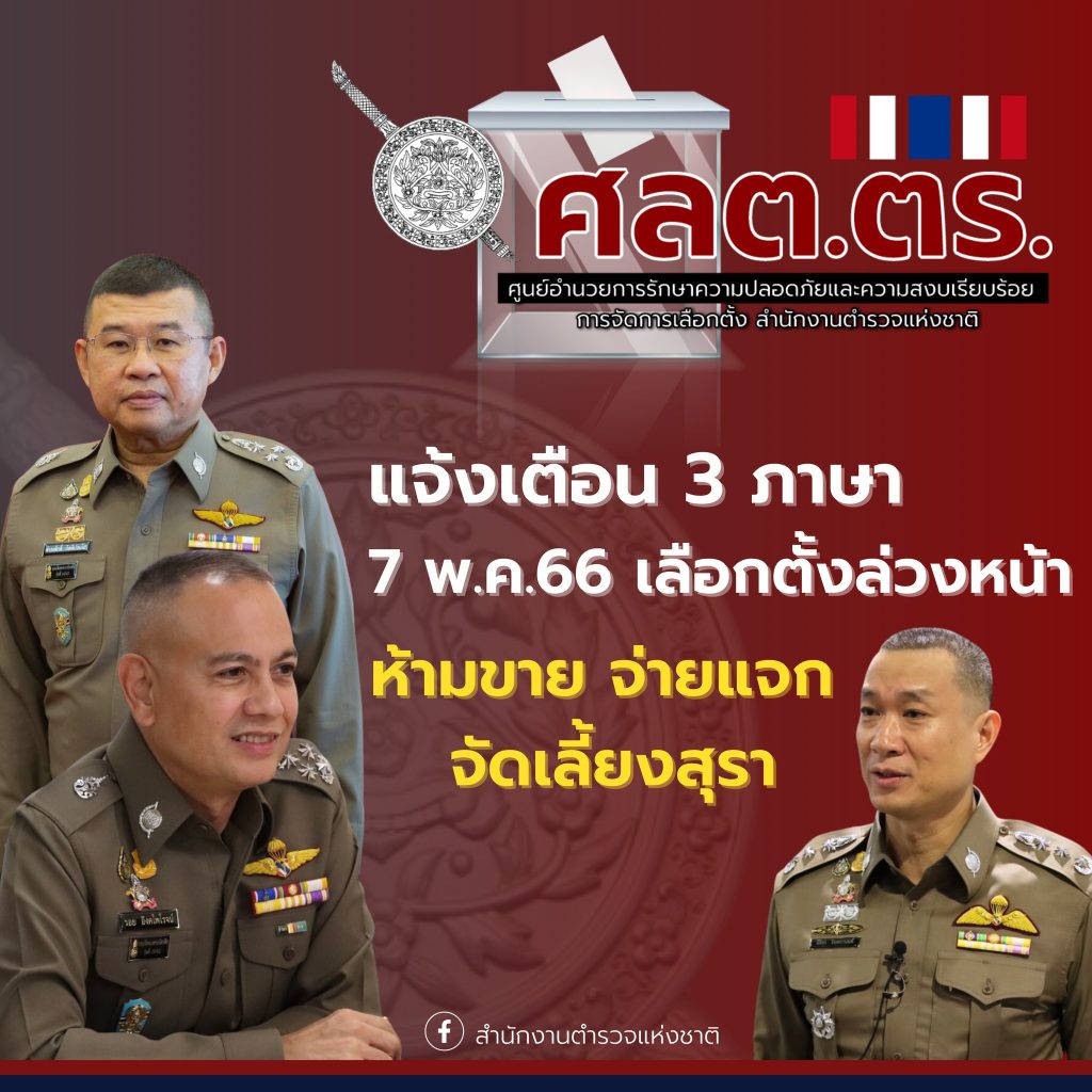เมื่อวันที่ 2 พฤษภาคม 2566 พล.ต.ท.นิธิธร จินตกานนท์ โฆษกศูนย์อำนวยการรักษาความปลอดภัยและความสงบเรียบร้อยการจัดการเลือกตั้ง สำนักงานตำรวจแห่งชาติ (ศลต.ตร.) เปิดเผยว่า ศลต.ตร.ขอประชาสัมพันธ์พี่น้องประชาชนชาวไทย ชาวต่างชาติ รวมถึงนักท่องเที่ยว เกี่ยวกับกฎหมายการเลือกตั้งที่สำคัญ โดยในวันที่ 7 พฤษภาคม 2566 ซึ่งเป็นวันเลือกตั้งล่วงหน้านั้น