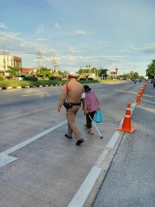 สุภาพบุรุษจราจร เจ้าหน้าที่จราจร สภ.แม่ใจ ให้ความช่วยเหลือคุณยายข้ามถนน เพื่อความปลอดภัย และห่วงใยประชาชนด้วยจิตอาสา